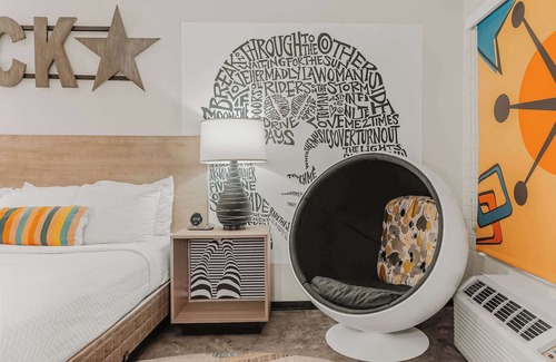 Welcome to our Retro King Room where retro design meets comfort for a fun-filled stay! Perfect for couples or singles, this vibrant room captures the essence of cool retro vibes while providing all the amenities you need.