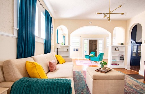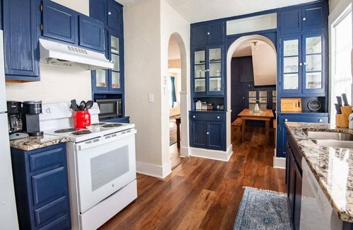 The adorable front porch will welcome you to our home! Once inside, you'll be in the spacious foyer with window seats, built-in cabinets, and a beautiful staircase that will take you upstairs to four bedrooms. Past the foyer is the living room with a queen sleeper sofa, smart TV, and extra seating. From here, you will see the dining room with space for 8 and the oversized kitchen which is fully equipped & ready for all of your cooking needs. There is one half-bathroom downstairs.