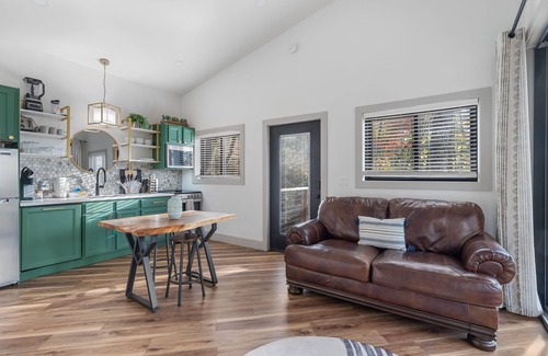 Inside of The Evergreen, you will find comfort and cozy aesthetics around every corner. There is a stocked kitchen, King bed, private soaking tub on the second level, main living space on the first floor, private deck/porch, and so much more!