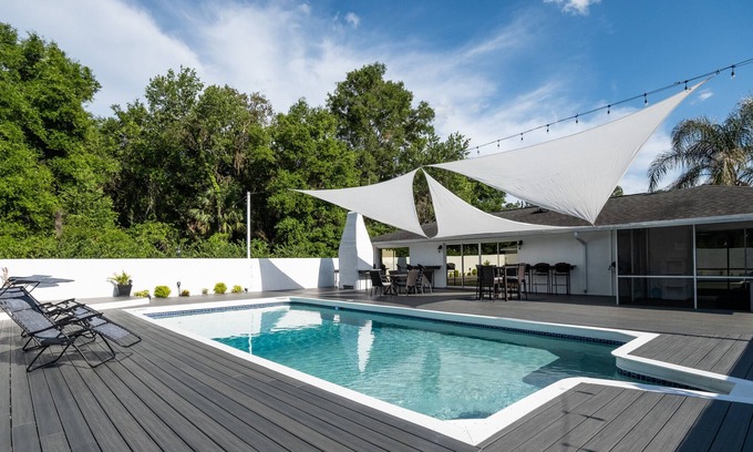 30 day bookings only. The Evergreen Villa is a private luxury farmhouse style home that sits on 78 acres of land. Enjoy the country privacy without being too far from the world famous Daytona beach. Perfect for events, family reunions and large gatherings, the 2500 square foot pool deck is great for hosting. Plenty of parking is available for any extra guests. Enjoy the Old Florida landscape from the comfort of this private ranch estate.