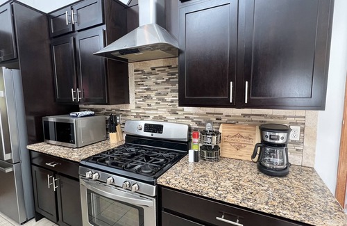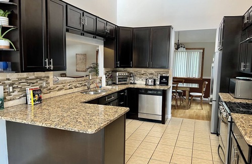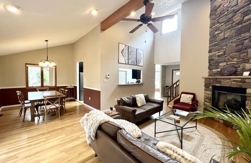 This is a large house with plenty of space, great for multiple couples or families! Beautiful high ceilings and natural light pouring in from the skylights. The kitchen is a chef’s dream, fully stocked with appliances (air fryer, blender, Instapot, etc) and plenty of utensils. The group can choose to eat in our beautiful dining room or dine al fresco on the patio! The den upstairs acts as another bedroom with a futon couch and room for the air mattress, or as an office with a desk for those who like to work from “home”. There is also a pack-and-play crib for toddlers or infants located in the master closet. The group can watch the game on our huge flat screen TV in the living room while the kids play upstairs in the den, which is stocked with board games. The Twin room has their own TV, as does the master bedroom. On chilly nights, light our beautiful ceiling-high stone fireplace and relax with hot chocolate, recapping the best moments of your trip.