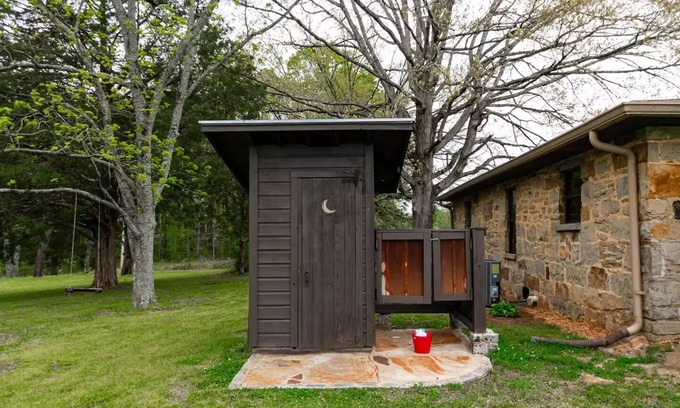 The kitchen has gas stove/oven, refrigerator with ice maker, microwave, dish washer, drip coffee maker. Small appliances include hand mixer, blender, hand chopper and toaster. Plenty of utensils for cooking and eating in. Plates, bowls cups and mason jars for drinking glasses. Kitchen has a table seating for 6. Spacious Bathroom has a claw foot soaking tub and walk in shower. Utility room has washer/dryer, full size ironing board and iron. Front and back porches are perfect for relaxing anytime of the day. Back yard has a fire pit with Adirondack chairs, string lights and gas grill. The outhouse has a flushing toilet, sink and outdoor shower.