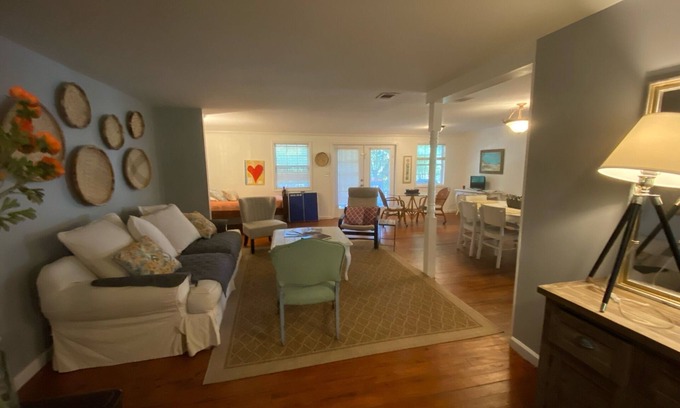 House is bright with open spaces perfect for gathering and games, and a kitchen for cooking large meals! Master bedroom with a screened porch. A big generous field for soccer and a 1/2 acre pond for fishing or reading beside the dock! Sunny front porch perfect for the first coffee in the morning!