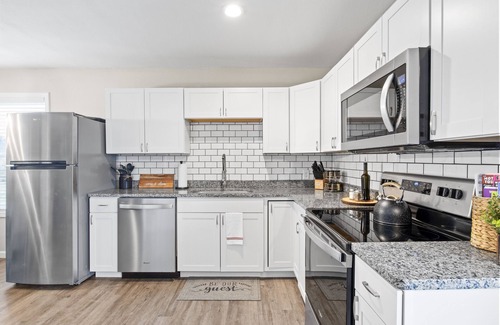 You have full access to your own private firepit and four comfortable Adirondack chairs, just be sure to bring your own firewood! There are three short term rental houses on the property, all of which are duplexes. Your house is the first one on the left, and your vacation unit is the closest one to the driveway labeled Building 1 Unit B. You will receive a custom entry code 24 hrs prior to check in. As a guest, you can enjoy access to the entire vacation unit (except for the cleaner’s closet), including the free WiFi, flat-screen TV, and a full kitchen. The walls are soundproofed but there should be an expectation of some noise that travels between the two units. In the case of excessive noise call immediately and it will be taken care of expeditiously. This Unit is the one closest to the road and you may hear some road noise during your stay.
