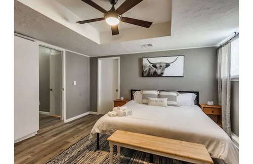 We invite you to relax and enjoy your stay at The Farmhouse Five. This five-bedroom home has been recently freshened and updated and is the perfect place to rest and relax. Everyone can sleep comfortably with our memory foam mattresses - two (2) king beds, one (1) double, and two (2) twin beds. Stay in and cook with a fully equipped kitchen or kickback and stream your favorite shows on the smart TV. Located with easy access to I-35, I-44, and I-240.