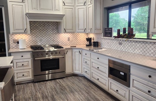 The Farmhouse is perfect for a cozy peaceful getaway with a beautiful view of the sunset!! The Farmhouse is a two bedroom, two sofa beds in the garage, two and a half baths with large living room, kitchen, and dining area combo, & a porch/ patio that almost wraps completely around the house. Amenities to include WiFi, Smart TVs for streaming, large front and back yard. Comfy beds with luxury linens and we have air mattresses for extra guests. The Farmhouse is 27 miles from Choctaw Casino Durant.