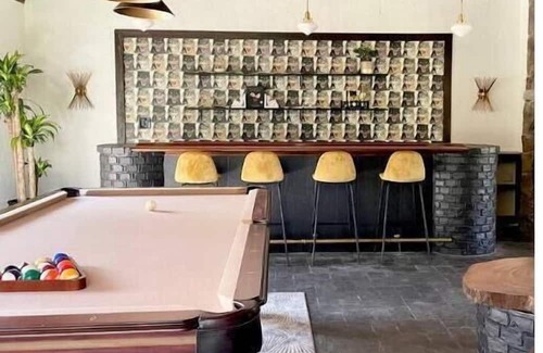 The billiards room boasts its own fireplace with a cozy seating nook, a pool table, and a bar at which you can mix your favorite cocktails and perch for hours.