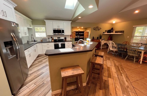 This 3 bedroom - 3 Bath home will sleep 15 comfortably. King bed in the master, with a smart TV and ensuite bathroom, 2nd bedroom has a Queen bed and Full futon - sleeps 4 in that room plus a smart TVhj. There is a updated full guest bathroom next to the second bedroom with a shower tub combo.