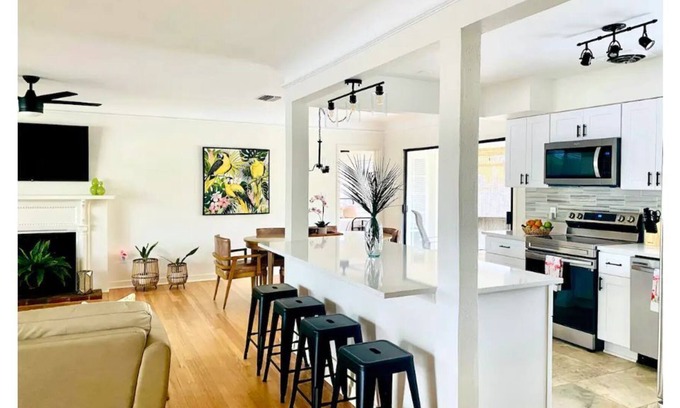 Experience The Flamingo Villa, one of Clearwaters’s most promising short term rentals. This tropical inspired property exudes the essence of a Florida vacation with retro inspired botanical decor throughout with just a splash of flamingo.