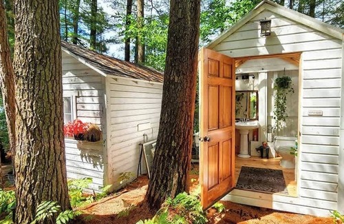 We have a full size bathroom and shower on the island, that is 100 feet away. You have a romantic private walkway along the island water front that leads you straight to the facilities.