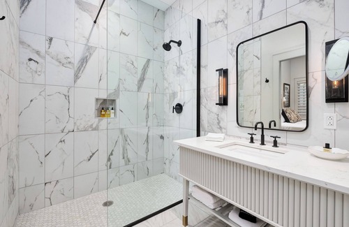 The suite’s spacious bathroom provides a refreshing zero-entry shower and is fully equipped with a Dyson hairdryer, luxury toiletries by D.S. and Durga, and luxurious Red Land Cotton towels, crafted in Alabama.