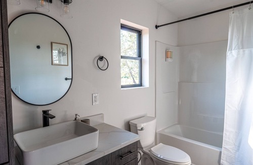 Enjoy our thoughtfully designed 280 square foot studio home that includes everything you'll need within a kitchen space, queen size bed, and large full bathroom. The home includes a 43" smart TV, fiber internet, and a seating bar to enjoy a meal at or work remotely from.