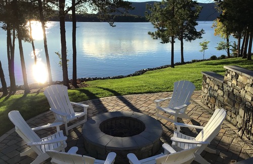 GORGEOUS VIEWS: The Fun Spot 2 is a beautifully decorated, lake theme home that sits on an end lot in a quiet cove with deep water and stunning, expansive lake and mountain views. Gorgeous, serene, sunrise views from the dock, patio, or porch are an excellent way to start your wonderful family vacation day! Two hammocks, large stone patio with fire pit and separate fireplace, outdoor dining under a pergola for daytime shade, and a 7 person hot tub to finish off a fun relaxing day of outdoor activities on this large, flat property. Patio kitchen island area includes a gas BBQ, refrigerator, and a two burner stove top as well as a stand alone charcoal BBQ. All you will need to prepare your favorite family meal, while keeping your favorite beverages cool with easy access. Don't forget your Smore's ingredients for the fire pit - Smore's Sticks provided. An additional cozy seating space with fire-pit is found down by the water's edge. Fire wood is provided.