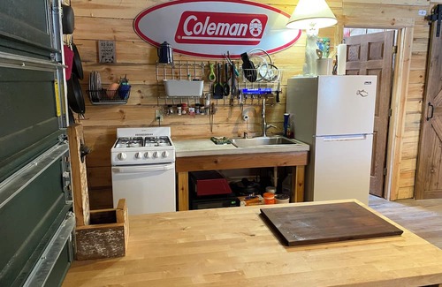 Most of the interior space is a large central room, shared in an open format between the living room, dining area and small kitchen space with a top freezer fridge, kitchen cabinet sink we built ourselves, complete with a hand-built concrete countertop, gas range and stove, and a cedar island flanked by bar stools on one side. Nearly one entire wall is an overhead door that can be raised to enjoy a warm summer morning or a cool, sunny fall afternoon with the football game playing in the background. There is a full length screen in place. It will not roll up, as it was damaged, but it works great down. The side zippers can be used to exit and enter.