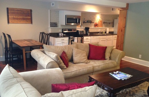 This beautifully renovated garden level apartment in Historic Downtown Savannah was built in 1872. Feel like a local while you stay in this meticulously restored and renovated two bedroom, two bath apartment. This unit features a queen bed, a double bed, fold out sofa, fully equipped kitchen, high speed internet, 45 inch flat screen tv. Easy meter-free on street parking.
