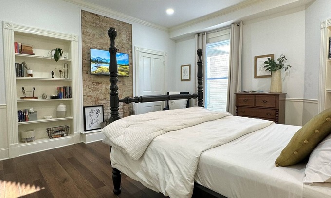 Book and enjoy the enchantment of an English cottage-inspired setting. Immerse yourself in a design that effortlessly melds modern elements with the authentic charm of the original architecture. Each room thoughtfully incorporates understated references to the house's history, showcasing mantles in the living room and main bedroom, exposed brick, and greenish hues in the kitchen. Crown molding and chair rails elevate the space with a hint of traditional elegance, crafting a delightful atmosphere in this recently revitalized getaway.