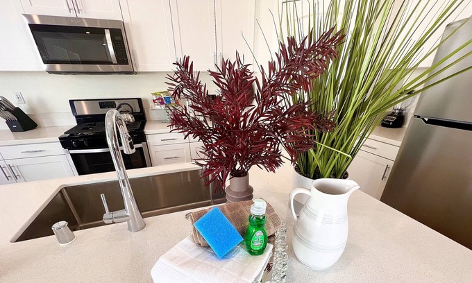 This spacious 2600 sq ft home offers ample living space for families or traveling nurses, with multiple bedrooms, bathrooms, and living areas for privacy and comfort