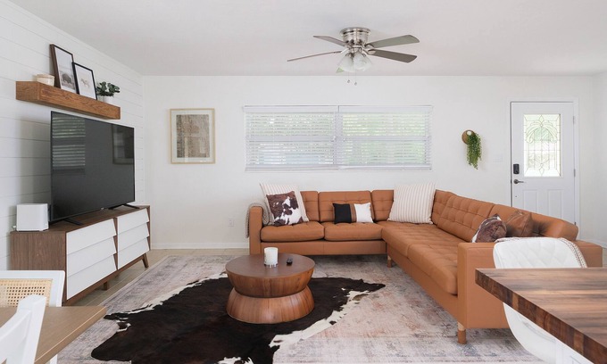 Cozy and luxe, you'll feel comfortable and relaxed in our stylish living room space. Enjoy watching the 65" inch ROKU TV with the ability to log into the major TV apps using your personal log in.