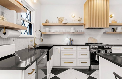 -The main house features an absolutely gorgeous kitchen that is FULLY STOCKED for our guests! We have ample dishware, silverware, etc. for all of the guests, and did not skimp on kitchen appliances and accessories.