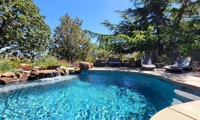 Overlooking beautiful Ashland, Southern Oregon’s home for theater and the arts, Gem House is a luxury home that integrates the natural elements of the land with the amenities that make for a fun, one-of-a-kind vacation stay. Greet the day from the sun porch, swim in the custom designed pool, dip in the copper cold plunge bathtub, and then settle in for a long soak in the 6-person spa, all with epic views of the valley and Mount Ashland. There are decks and lounging areas everywhere, and with vaulted ceilings and picture windows throughout, you are never far from a stunning view.