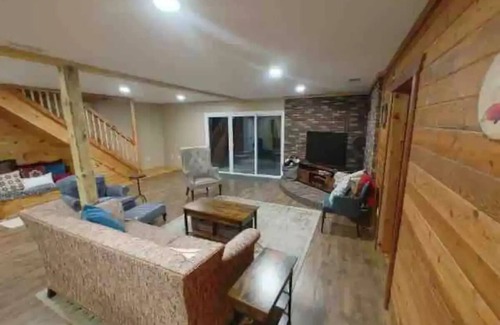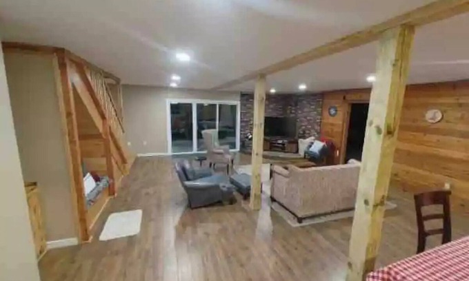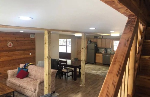 The cabin has over 3,000 square feet available for you to relax and enjoy. Open floor plan connecting the kitchen and main living area with a large flatscreen tv and seating all over. Large kitchen with plenty of room to cook and a table that can seat 10+. The cabin has beds for 8 adults along with plenty of space for air mattresses. This cabin has plenty of space to enjoy outdoor games There are puzzles, board games.