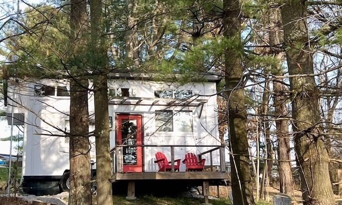 This tiny house features a kitchen with lots of amenities to prepare and serve meals, a full bath with shower, vanity/sink, and flushing toilet, a queen size loft bed, a sofa bed area that converts into a full sized bed, a deck with a view the lake, and a fire pit area for roasting marshmallows and enjoying sunsets and the night stars. Located less than an hour from downtown Columbus, this tiny house has all the comforts of home – just bring your toothbrush and a change of clothes and you're all set to enjoy the renowned Hocking Hills hiking trails, a nearby winery, and within walking distance of restaurants, a brewery, and a coffee shop.