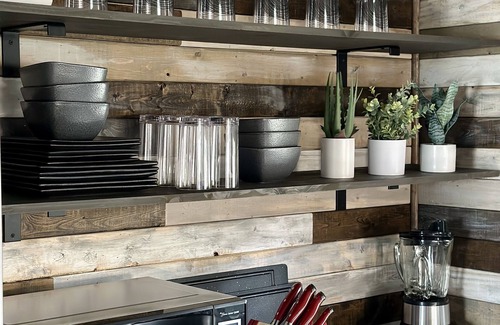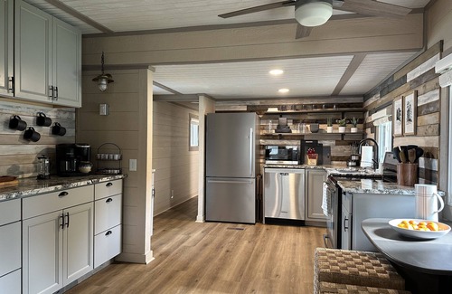 What you will experience at this home is Over 130' of spectacular panoramic lake view frontage overlooking nearly the entire Honey Creek Cove. You’ll have direct access down the stairs to the lake with a private dock. Unlike other properties, stay here and you’ll be minutes from restaurants and shopping over the bridge in Grove, the largest city on Grand Lake! The property has gone through a total renovation and a complete redesign. The outdoor seating and lush lawn area offers outdoor activities for everyone, including horseshoes on the lower level. Head down the stairs to the lake to a covered dock which is great for fishing or swimming, the slip is 30’ to handle most boats. Relax with a cold beverage or roast marshmallows at the fire pit. The kids will enjoy the outdoor games & will love the play station in the bunkhouse. There is a BBQ area that has a Jenn-Air BBQ, a picnic table and 4 comfortable chairs overlooking the beautiful view. The home sits in a clean, quiet and safe neighborhood with owners available for any concerns. This property sleeps 4 in the main house and up to 6 children in the bunkhouses bunk beds.