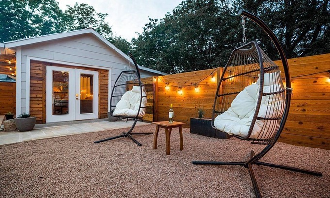 There is a 29" barrel charcoal grill/smoker for guest use in the back yard patio, perfect for preparing lunch or dinner meals. Cushioned seating for four under the pergola is a great place for meals and the firepit area also comfortably seats four. There are two swinging cage chairs to enjoy the breezes and wonderful Hill Country weather and string lights to bring the entire backyard oasis alive at night. Check in the kitchen, because we even have roasting sticks for smores! New for Fall 2023, we now have a 2-person hammock under our pergola which is perfect for enjoying the cooler Hill Country mornings and evenings. Lay down and relax or even take a nap! This home truly has outdoor living in mind.