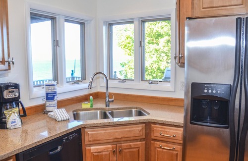 There are just a few steps leading to the main entry, which opens up to the stunning great room. Large picture windows will draw your attention, as you gaze at the exceptional views of Seneca Lake. An open floor plan provides great flow from the living area through the dining and kitchen areas, separated by only one wall, one side with a gas fireplace and TV facing the living area, and the opposite side with a wine bar facing the kitchen area. The living room features an overstuffed couch, and a wall-mounted fountain to add to the ambiance.