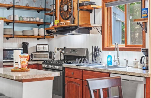 Inside, the inviting living room features vaulted ceilings with expansive windows that show off the forest surroundings. Multiple comfortable leather couches, a stone fireplace, and a flat-screen TV create a cozy atmosphere. The dining area seats 6, with extra bar stools at the kitchen island to accommodate bigger groups. Prepare your favorite home-cooked meals in the fully-equipped kitchen which offers every appliance to indulge in your inner chef.