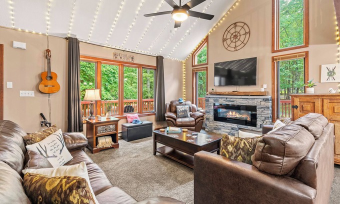 Welcome to The Great Escape! Boasting a game room, three TV rooms, and ample outdoor amenities, this entertaining haven awaits for a memorable Poconos getaway.