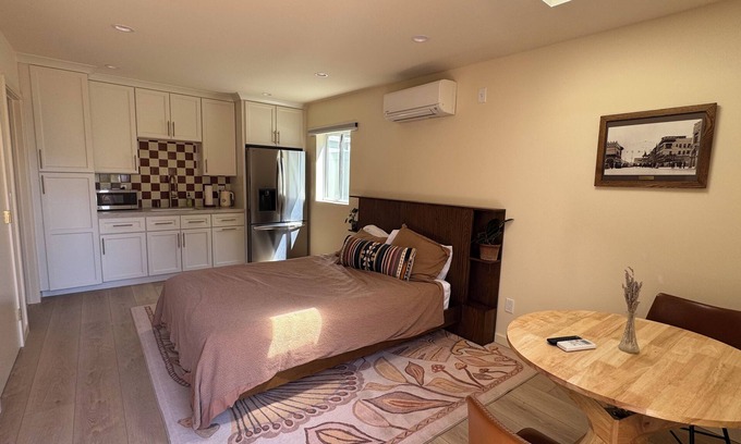This brand new space was renovated from top to bottom in 2025. Comfy queen bed. Table with two chairs. The kitchen has a fridge/freezer, microwave, coffee maker, hot plate, and is fully stocked with pots, pans, and utensils! The private patio is just for our rental guests and has an outdoor table set - perfect for morning coffee, dinner al-fresco, or working out in the sunshine (the wifi connection is strong)! Please feel free to use our surfboards, tennis rackets and bikes! We have a big backyard full of garden and fruit trees (which are all fair game to eat) - please enjoy it!