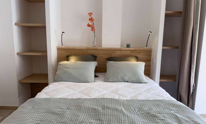 For the night, you will appreciate the quality of the premium bedding (160 cm bed), while during the day, you will enjoy a living space open to the garden with a fully equipped kitchen (refrigerator, induction hob, oven, microwave, dishwasher, washing machine...).