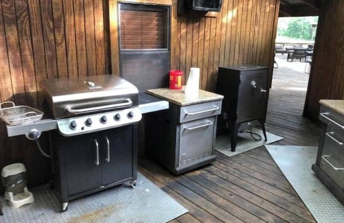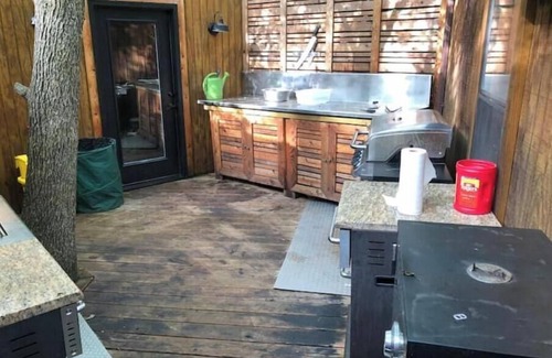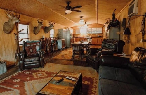 This place is perfect for a weekend get away or event. It comes with everything you need including 441 acres of trails for walking. There is also a mountain you can hike on the west side of the property. It has 2 ponds, full kitchen, full bath, laundry, sleeps up to 25, and an ice maker. This place is very secluded with a nice party deck and dance floor. It also has a full game room including pool, air hockey, and foosball. Only 40 minutes from Tulsa in Okmulgee, OK.