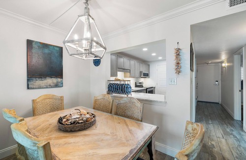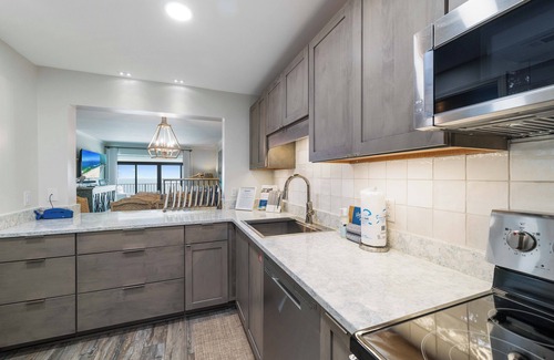 The open living area features a spacious sectional sofa, flat-screen TV, and direct access to a private balcony where you can take in panoramic views of the Gulf. The modern kitchen is fully equipped with stainless steel appliances, granite countertops, an electric tea kettle and plenty of space to prepare meals. A cozy dining area sits just off the kitchen, perfect for enjoying meals with family and friends.