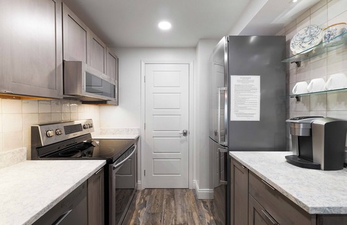 The primary bedroom offers a king bed and a private ensuite bathroom for added comfort. The second bedroom includes two XL twin beds, and a second full bathroom is located in the hallway. For additional sleeping space, the living room includes a convenient sofa sleeper.