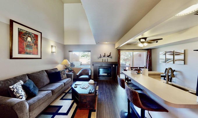 Make this bi-level, luxury condo your next vacation home and enjoy many high-tech extras and brand new private hot tub. This 2 Bedroom, 2 Bath unit on the Moab Golf Course has a 42-inch Plasma TV and a Blu-Ray Player in the living room. Enjoy 120 Channels with HD from Dish Network. The living room floors have just been redone in high-end Italian porcelain tile, and really add a modern look to the condo. The kitchen has just been upgraded with new stainless steel appliances. The master bedroom is also equipped with a TV, for the ultimate in entertainment options. New carpeting covers the stairs and upstairs level. In-unit, high-speed Wi-Fi, and digital lock complete the high tech package. A private hot tub has just been added to the private patio. Enjoy the beautiful Moab Sunsets while sitting in the hot tub or grilling up some burgers.