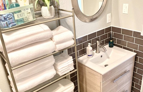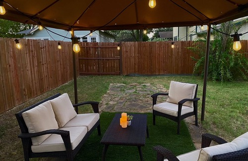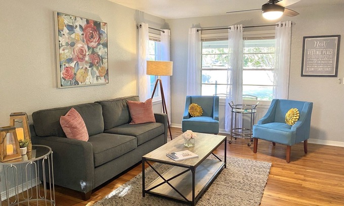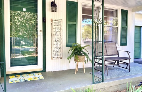You'll love your stay in this refreshed 1950's cottage! Modern furnishings, fresh linens, thoughtful amenities and a fully stocked kitchen ensure every comfort of home. Separate bedroom with comfortable beds make it a great choice for individuals, families or couples traveling together. Enjoy your morning coffee and a complimentary bottle of wine by the propane fire pit in your private fenced backyard. Walk or ride the trolley to the square from our Historic District location. Dog friendly for pups under 20 lbs with a pet fee!