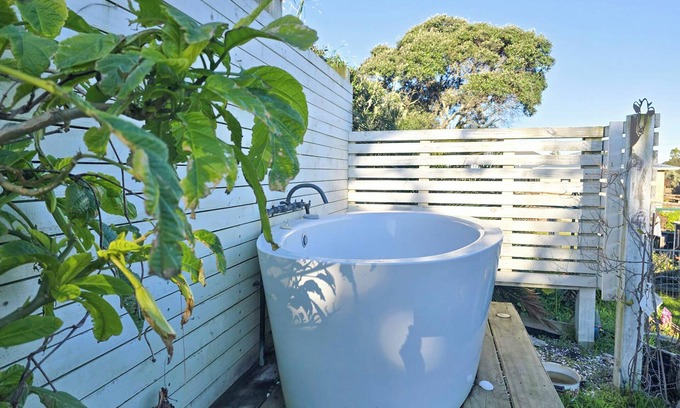 Hot/cold Outdoor shower for rinsing off after the beach and an outdoor bath