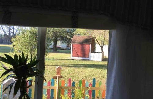 Kokomo Farms is a Tranquil Organic Farm . The property includes our family of rescued barnyard animals, horse pastures, and wooded area. Relax in the Zen garden hot-tub (garden also has yard games, artwall & grill). Wander through the barn & visit the chickens, enjoy our community fire pit, & plenty of space for walks thru open grassy areas, wooded hammock & short trails. Experience a starlit sky on our stargazing bed without light pollution & wakeup to the sounds of nature all around. The space is an adorable, converted cargo trailer, private tiny house with a Queen size memory foam bed, Kitchenette, love seat, and ensuite full bath. This adorable guest house is Nestled in it's own little corner of the farm. Nearby you can make new friends with a small flock of some beautiful Blue Americauna and Silky White chickens(including the famous Princess) who love treats while they free range. This space includes a tiny front yard and even a back patio under the trees. If you're lucky you'll wake to the sounds of nearby donkeys and the rooster calling for Morning breakfast. You are a short walk to the Main house ( where you can relax on the wraparound porch or play a game), the Zen Garden and hot tub, the community Artwall, Barn and many yard games . At night watch the stars from your tiny house or walk to the back of the property and watch on the star gazing bed. Please click on my profile to see all of our unique accommodation options.