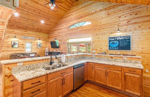 Welcome to "The Hawks Nest" on the Current River! This stunning cabin is the perfect place to relax with family and friends while enjoying beautiful scenery. The cabin features everything you need to enjoy a fun, relaxing stay. The deck has amazing views overlooking the water, great for morning coffee. A dock allows for easy access to the river, or simply a spot to soak up some sun on the loungers. The bonfire is the perfect place to wind down the evening with some s'mores.