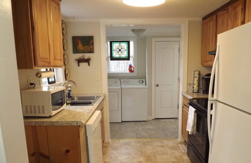 Detached and bordering woods and gardens, the Woodhouse sitting porch is entertained by a host of flowers and birds in the spring. The front door opens up to a living room with a 40” smart TV and High Speed Internet. Two bedrooms on either side of the living room have full sized beds. The back of the house has a full kitchen, laundry room and a small full bathroom with shower only.