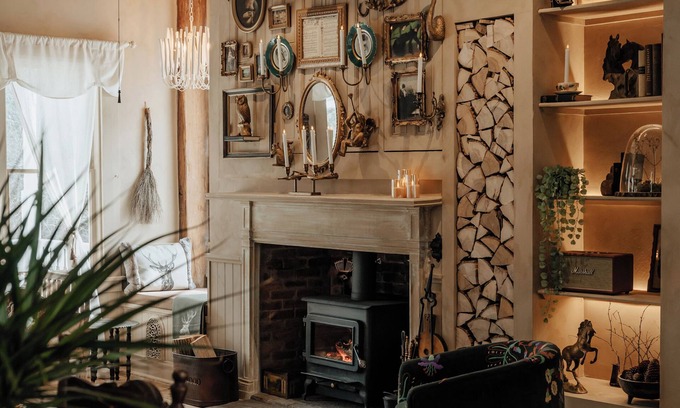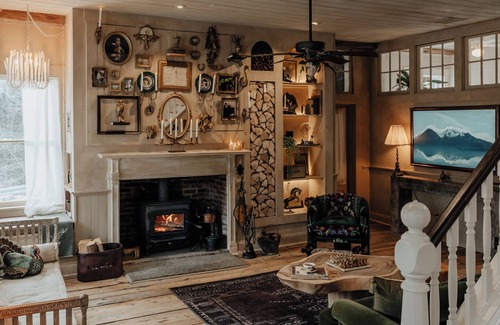 The house features 4 comfy bedrooms, impressive living & dining areas, chef's kitchen, vintage bathrooms with clawfoot bathtubs, high ceilings, rustic & refined decor.