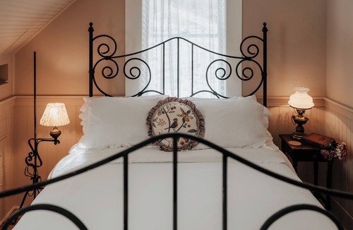 Arrive at the second floor and you'll find 3 luxurious and artfully decorated bedrooms: Rose, Iris, Lavender, each painted in their signature colors. The bathroom is huge and features a gorgeous antique bathtub with rain shower and a spacious & elegant powder room.