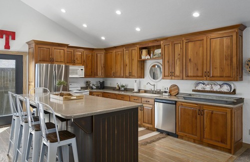 The Barn's interior reflects a perfect blend of modern comforts and rustic elegance. The thoughtfully designed living spaces feature tasteful décor, creating a welcoming ambiance for all who enter. Gather with loved ones in the inviting common areas, where conversations flow freely and memories are made. The open-concept layout seamlessly connects the living room, dining area, and fully-equipped kitchen, allowing for effortless socializing and culinary adventures.