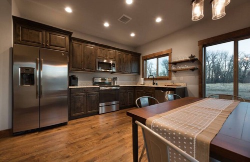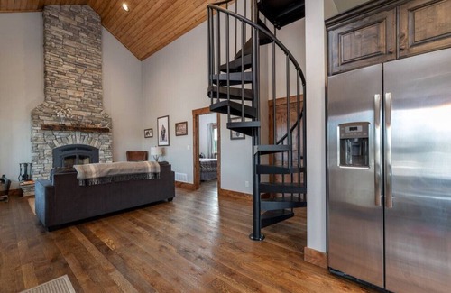The Hideaway Cabin is one floor with two bedrooms, one bedroom offering a king bed and the other offering a queen bed. The home has one bathroom with a stack-able washer and dryer for convenience. Granite counter tops and an open floor plan. The stocked kitchen has stainless steel appliances, plenty of space at the dining table and opens up to the living room with a wood burning fireplace. A large T.V. with DVD player is located in the loft space that is accessible by a spiral staircase. The mattresses, towels, and linens are all new & clean!! The home also offers WiFi, a blow dryer and an iron and ironing board for your convenience.