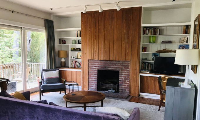 Hideaway Perch at Half Moon House is a light-filled upstairs retreat with a treehouse feel, tucked inside a restored 1914 carriage house. Blending mid-century modern decor with an eclectic, rustic cabin vibe, it offers a comfortable bedroom, a kitchenette, and a private bathroom with a wall-mounted showerhead and a historic shallow soaking tub. A private balcony overlooks the lush garden, creating a peaceful escape just minutes walk from Forsyth Park, Starland, and many top restaurants.