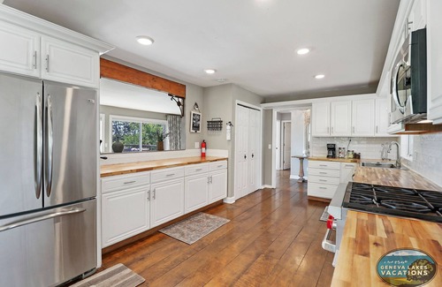 Inside, the home is just as impressive, with ample room for everyone to find a cozy corner or come together in communal areas for connection and entertainment. Relax in the main or basement living areas on plush sofas and stream your favorite shows on the smart TV. The seamless flow between indoor and outdoor living lets the lake breeze fill the home, while fireplaces in each living space keep things warm and cozy during cooler months, perfect for family movie nights.The fully equipped kitchen is sure to appeal to the chef of the group, featuring stainless steel appliances, butcher block countertops, and sleek white cabinetry stocked with cookware and dining ware. Two dining tables, seating 8 and 6 respectively, are perfect for formal meals or impromptu game nights.