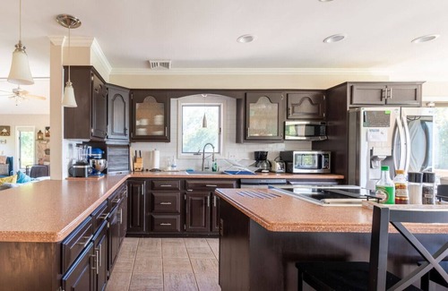 Work, play, and relax at a large & quiet getaway house on 7+ private acres with luxury & utility alike. This pet-friendly, family-friendly retreat boasts a saltwater pool, firepit, grill with outdoor dining, & 6.5' high fence surrounding the yard. Get competitive with billiards and board games, enjoy the expanse kitchen, cozy up to a fireplace, or get to work with high speed internet.