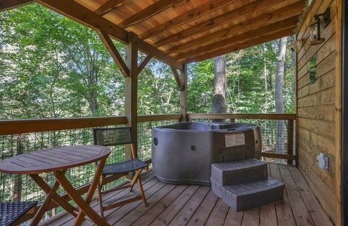 Step into creation's embrace, as you walk out onto your private lower deck and unwind in a two-person hot tub! Nestled beneath the trees and surrounded by the soothing sounds of the forest. As night falls, gather around the crackling fire pit for s’mores, campfire stories, and laughter echoing through the hills. This tucked-away outdoor haven invites connection, comfort, and peace in every season. (Note: if weather is extremely cold, we cannot guarantee the full hot tub temperature)